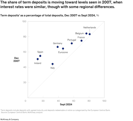 Bởi vì vậy, các ngân hàng đã tăng lãi suất trả về cho tiền gửi nhằm đảm bảo nguồn vốn và giữ khả năng cạnh tranh với các đối thủ số khác. Sự cạnh tranh về giá tăng cao, tỷ lệ dự trữ thanh khoản giảm và vị thế cho vay trên tiền gửi ngày càng khó khăn, đã khiến cho lãi suất tiền gửi các ngân hàng châu Âu tăng đáng kể. Theo phân tích McKinsey dựa trên dữ liệu của ECB, lợi suất bình quân gia quyền từ tiền gửi hộ gia đình trong khu vực đồng euro đã tăng từ 0.7 % vào tháng 1 năm 2023 lên đến 1.5% vào tháng 10 năm 2024.