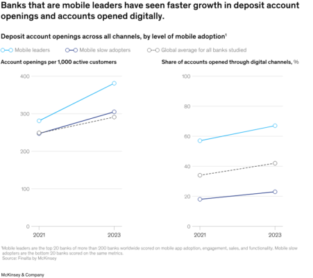 Việc mở tài khoản tiền gửi—như tài khoản tiết kiệm, tài khoản thanh toán, tài khoản giao dịch hay tiền gửi có kỳ hạn—đã tăng mạnh trên toàn bộ lĩnh vực trong vài năm qua. Và theo Finalta của McKinsey, các ngân hàng được coi là dẫn đầu về di động đang ghi nhận những mức tăng trưởng vượt trội. Phân tích của Finalta dựa trên dữ liệu từ hơn 200 ngân hàng trên toàn cầu cho thấy rằng vào năm 2023, trung bình mỗi 1.000 khách hàng hoạt động, các ngân hàng đã mở 291 tài khoản tiền gửi, tăng 17% so với năm 2021 (xem Biểu đồ 2). Một nhóm nhỏ các ngân hàng dẫn đầu về di động cho kết quả còn ấn tượng hơn, khi số tài khoản mở tăng lên 381 trên mỗi 1.000 khách hàng hoạt động vào năm 2023, tăng 35% so với năm 2021. Các ngân hàng dẫn đầu về di động cũng đã tăng đáng kể tỷ lệ tài khoản tiền gửi được mở qua các kênh kỹ thuật số (trang web và ứng dụng di động).